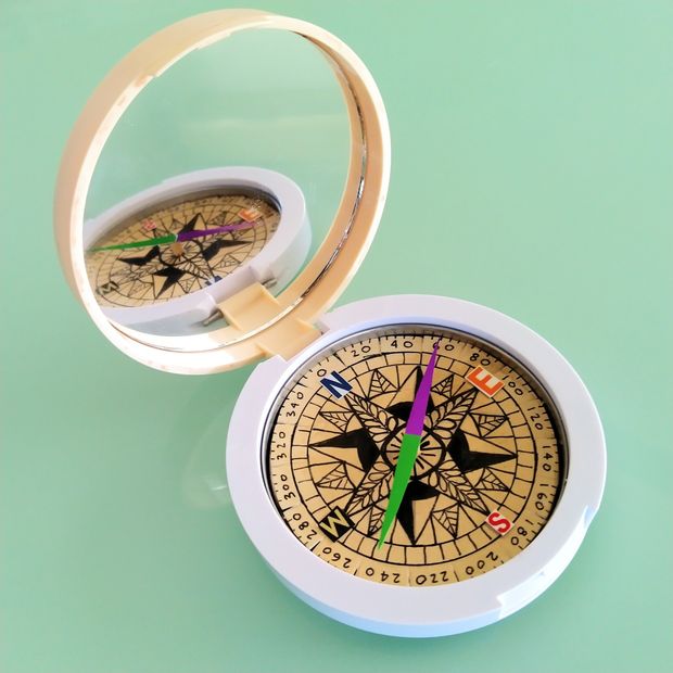This piece is inspired by the concept of morality in the marketplace. The materials used to make it were salvaged from my own recycling or rubbish bin – an old makeup compact holding the beer can arrows pointing between the cardboard cardinal directions drawn on old ink pens, mirroring back on itself.